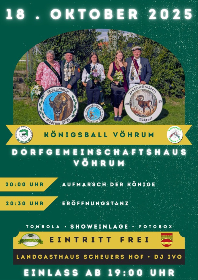 Am 18. Oktober 2025 um 20.00 Uhr findet im Dorfgemeinschaftshaus der diesjährige Königsball statt.
